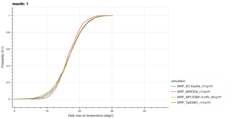 Figure 1. An example of the long-term climatological conditions of daily max air temperature, for use in a TMY. This CDF represents the baseline conditions of January max air temperatures in 4 bias-adjusted WRF models at Los Angeles International Airport (LAX) from 1990-2020.