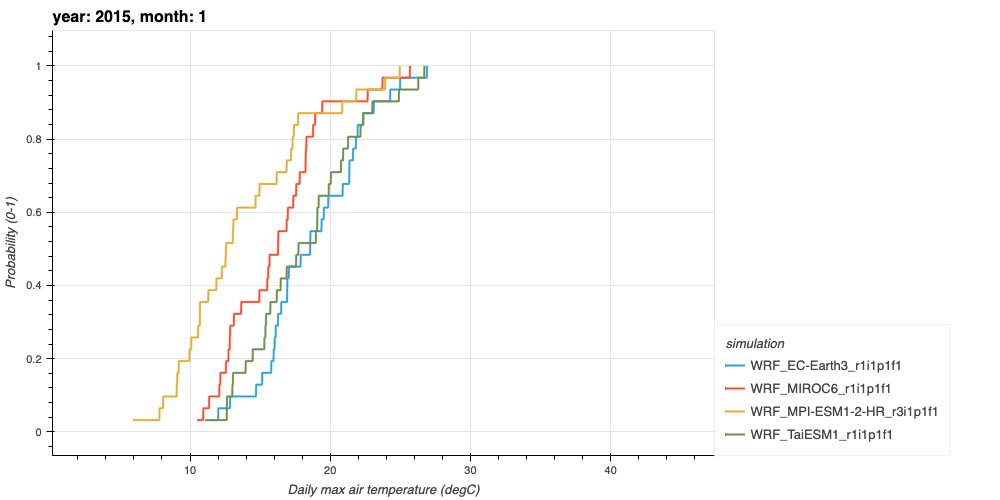 Figure 2. An example of a candidate month’s daily max air temperature, for use in a TMY. This CDF represents the January 2015 conditions of max air temperatures in 4 bias-adjusted WRF models at Los Angeles International Airport (LAX). The TMY process identifies the closest candidate month to the long-term climatological conditions to pick a “typical” month of January. For example, one would look for the closest instance of the distribution in this Figure to that of the first figure.