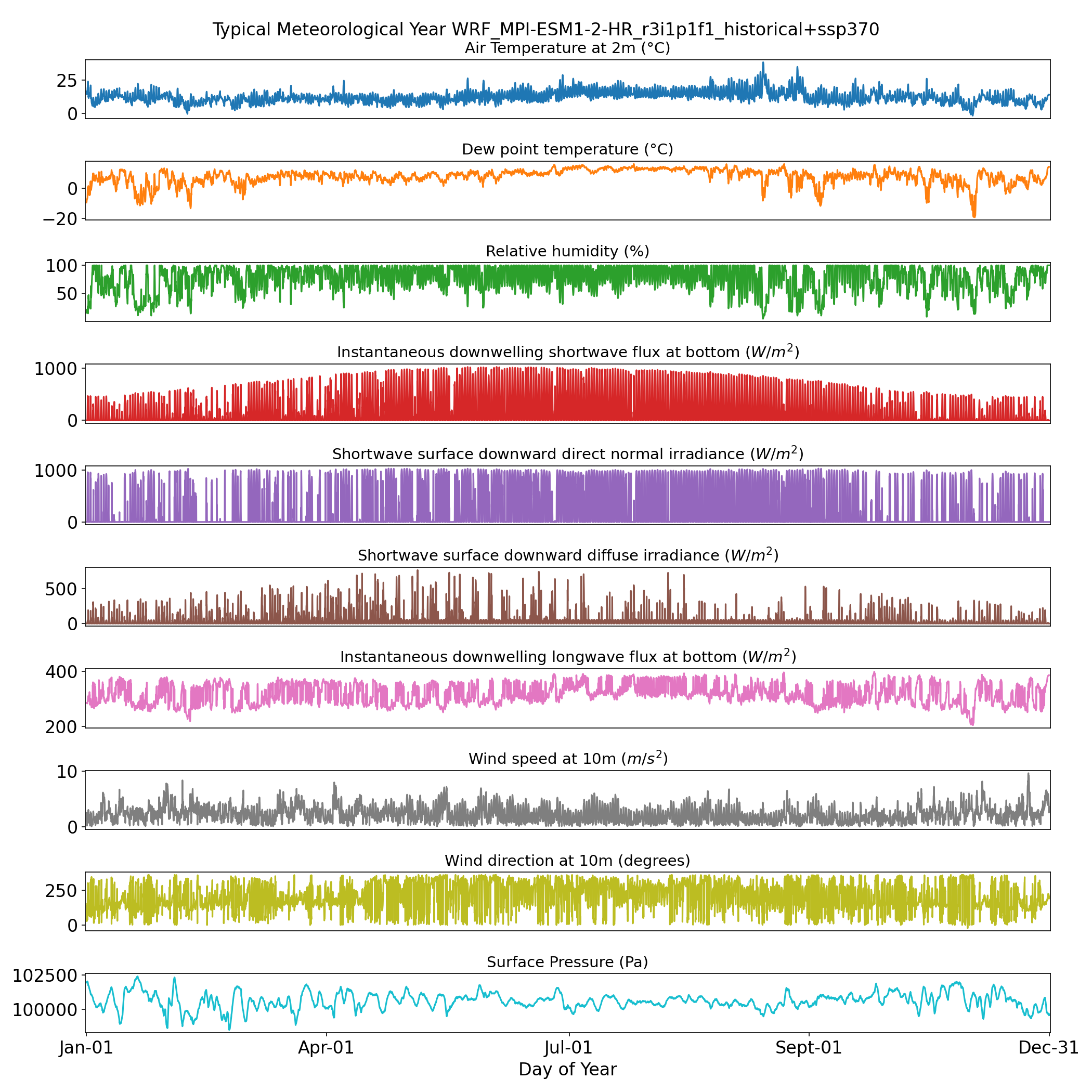 Once weighted, the AE selects the top month for each month of the year that has the lowest weighted sum, meaning that the candidate month is the closest or most “typical” to the long-term climatology for that specific month. The AE TMY method ensures that model data is kept intact, meaning that the most typical month is selected from the same model, not across models (e.g., not: January from MIROC6 and February from EC-Earth3). The end result of this process is that a TMY profile is generated for each model. This provides a great opportunity to be able to do multi-model comparisons of TMY profiles in a physically consistent space.