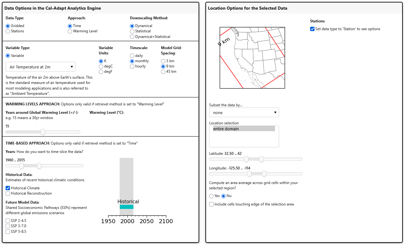 To support a range of workflows, AE provides data access notebooks that demonstrate various methods, including direct code-based access using climakitae, an intuitive graphical user interface (GUI) using the add-on package, climakitaegui, and options for accessing data outside of the AE environment.