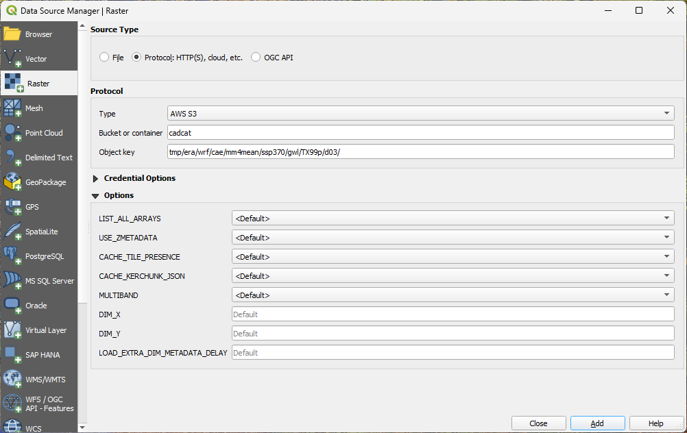 To open the S3 Zarr store go to the menu item Layer→Add Layer→Add Raster Layer. This will bring up the Data Source Manager | Raster interface. Under Source Type switch the radio button to Protocol: HTTP(S), cloud, etc. then under the Protocol section choose AWS S3 for the Type, cadcat for the Bucket or container, and then enter the relative path to the Zarr store, which can be found by using the AWS Explorer or Data Catalog.. As an example to load the multi-model mean extreme heat absolute Zarr store, which is stored at various warming levels enter “tmp/era/wrf/cae/mm4mean/ssp370/gwl/TX99p/d03/” for Object Key.