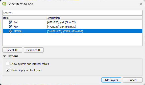 Clicking the Add button will bring up another menu. Select the variable name, in this case, TX99p. The shape of the array can be seen in the description with 472 by 223 spatial cells and 5 warming level bands.